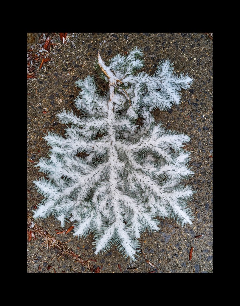 I spotted a fallen evergreen branch on the ground. And apparently whatever snow remained on that evergreen branch’s needles stayed there as the branch hit the cold, wet sidewalk.