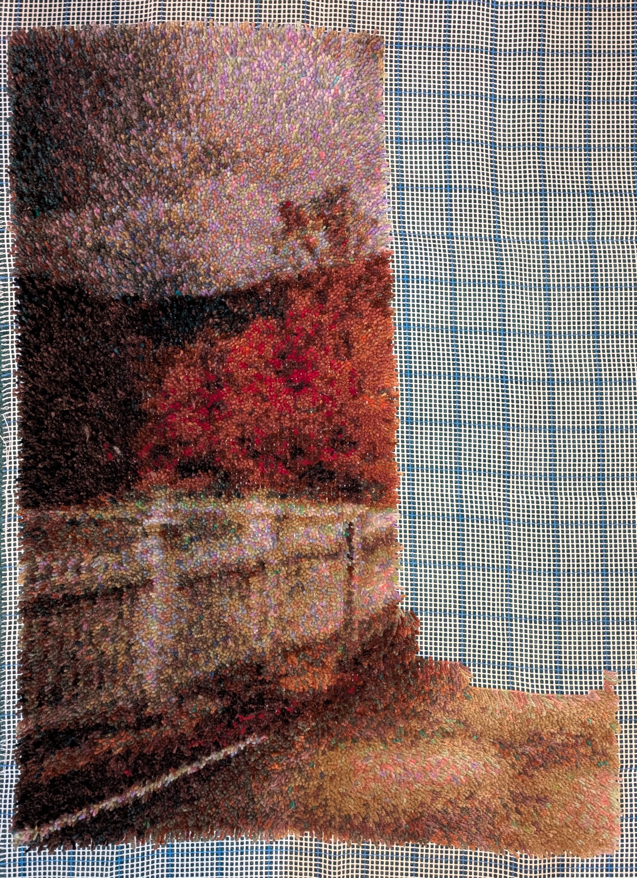 And after much effort and lots of patience … I’ve hooked all the way up to the top of the canvas, and started work on raising the third column of this textile project.