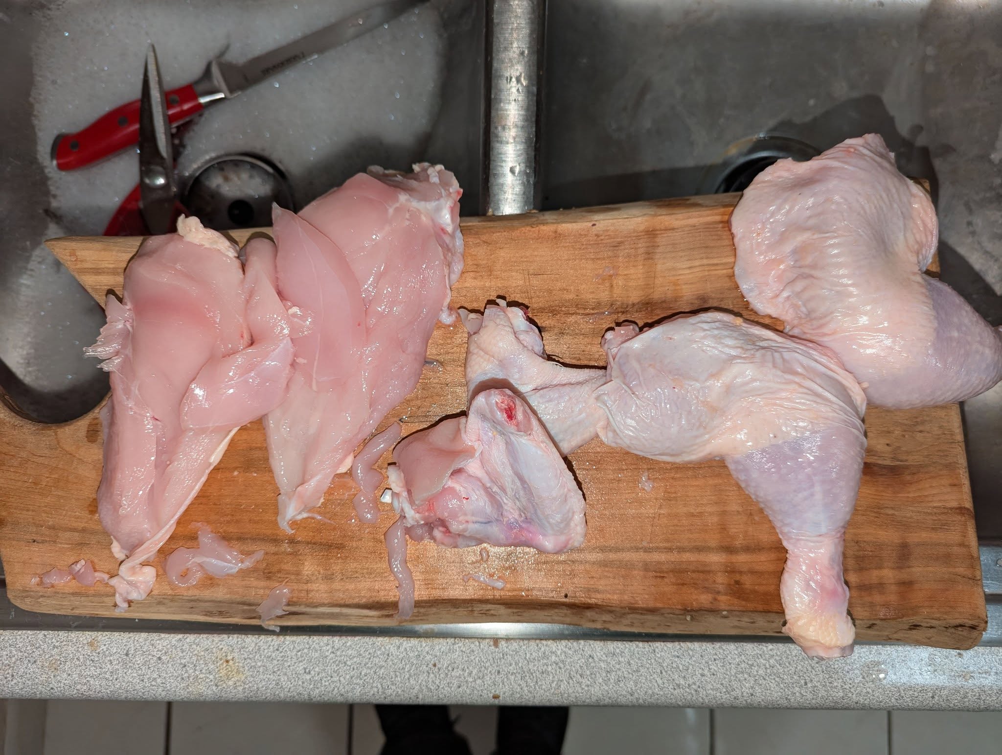 Started with the legs. Sliced open the skin. The chicken’s skin, not mine. Popped the hip joints. Sliced off the legs and thighs. Put them in a resealable plastic bag.