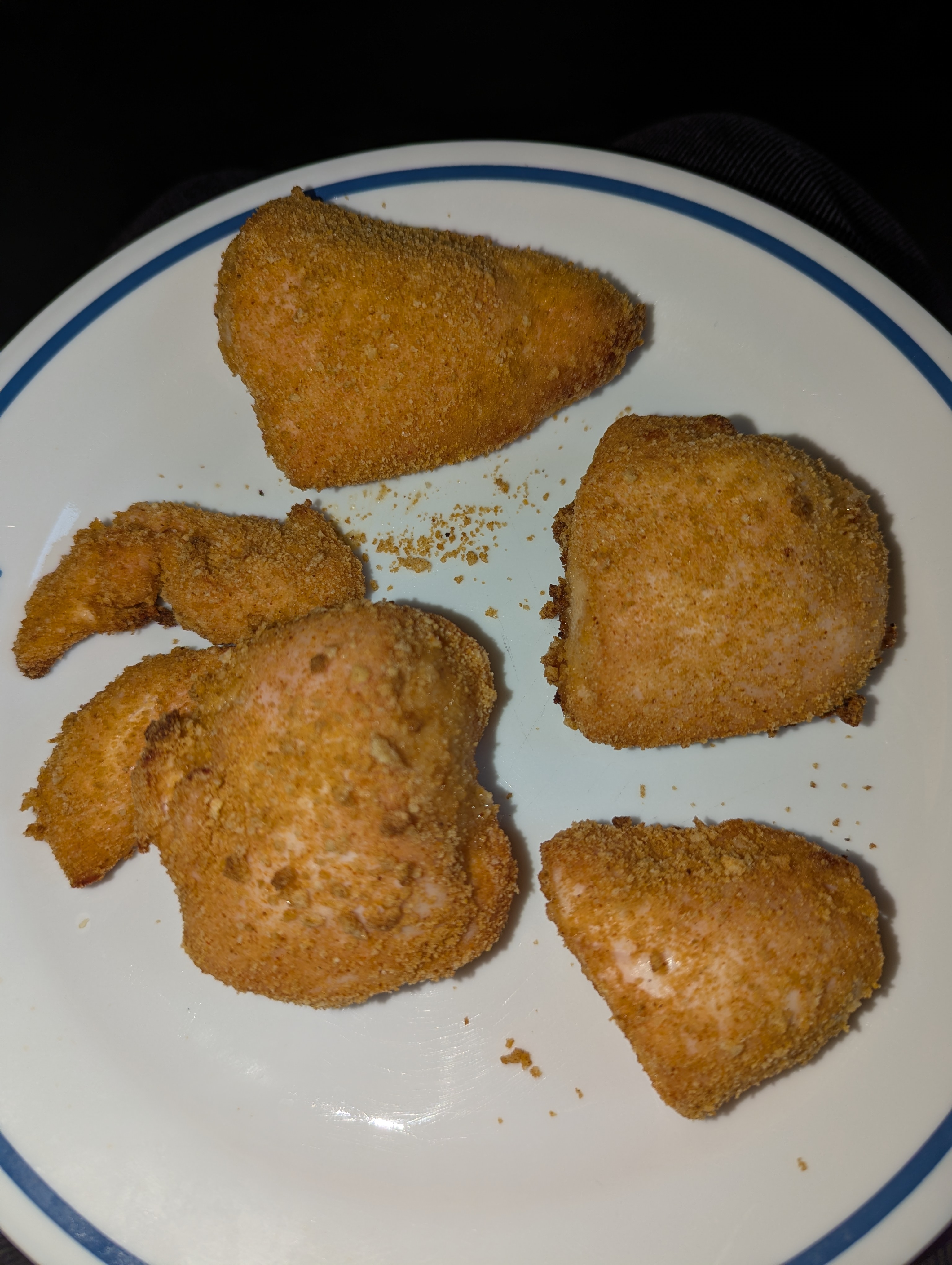 I sliced up the chicken tenders and coated them with a little Shake ‘n Bake (which, by the way, is getting hella expensive these days – $4 for a pack of two pouches, and they don’t even give you the plastic shaking bags any more). Just another example of Trumpflation.