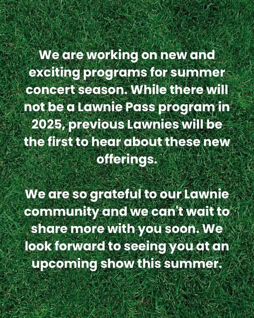 We are so grateful to our Lawnie community WHO WE EXTORTED MONEY FROM FOR YEARS AND GAVE YOU BAD SEATS WHERE YOU COULDN’T SEE THE BAND and we can’t wait to STEAL MORE OF YOUR HARD EARNED DOLLARS soon. We look forward to RIPPING YOU OFF AND BLAMING IT ON DEI AND TARIFFS AND BIRD FLU AND BIDEN this summer.