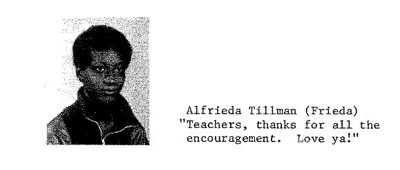 Frieda Tillman was one of my first connections in high school. She was my first true friend, and we remained friends throughout our high school years. We took many classes together, we participated in several extracurricular activities together, and we were both champions on the WRGB Answers Please quiz show from 1981.