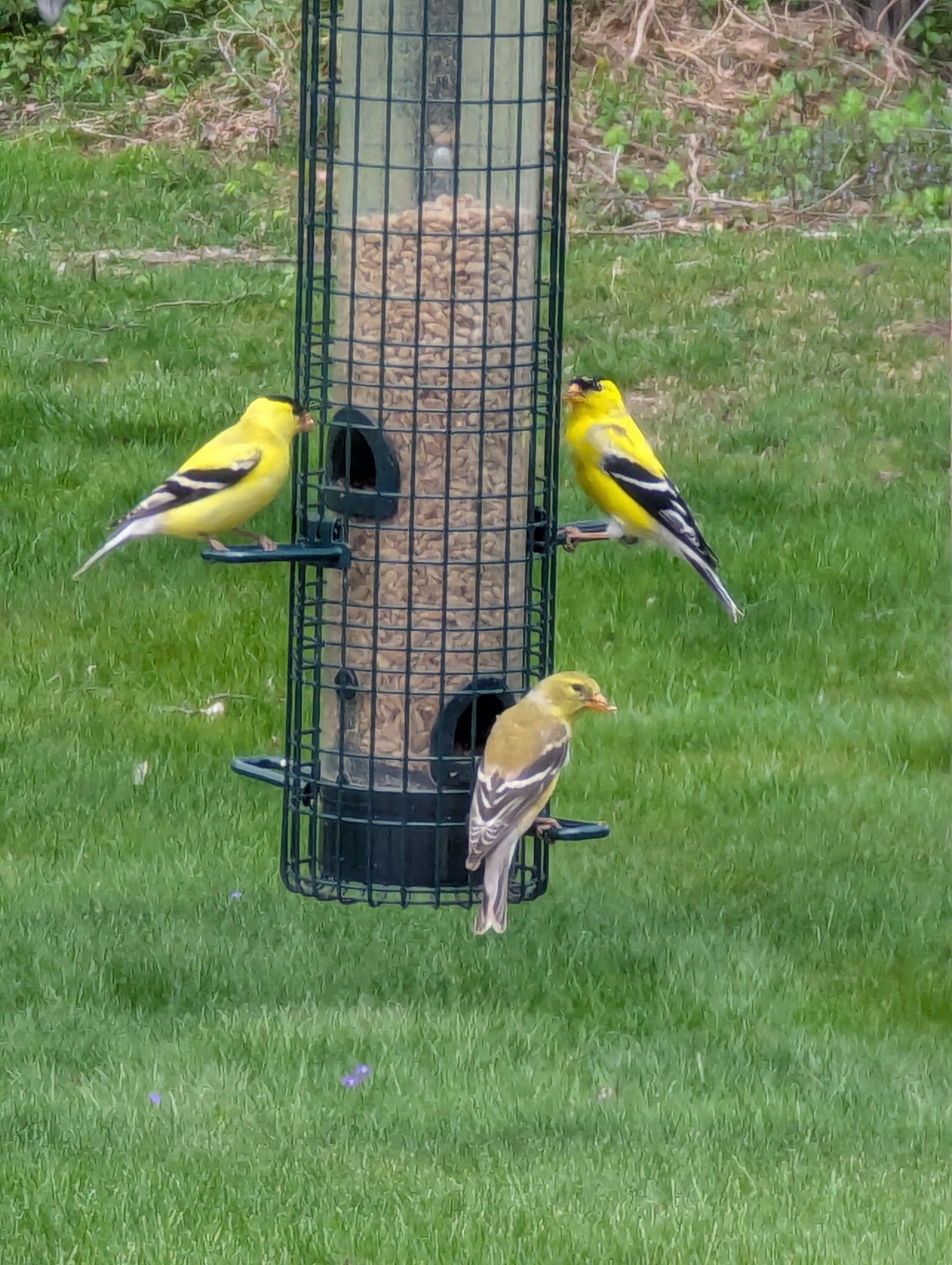 Yesterday, I caught this little shot of three American goldfinches snacking on the bird seed. Normally you get one or two birds on the feeder and if you’re quick, you can get a photo before they fly away.