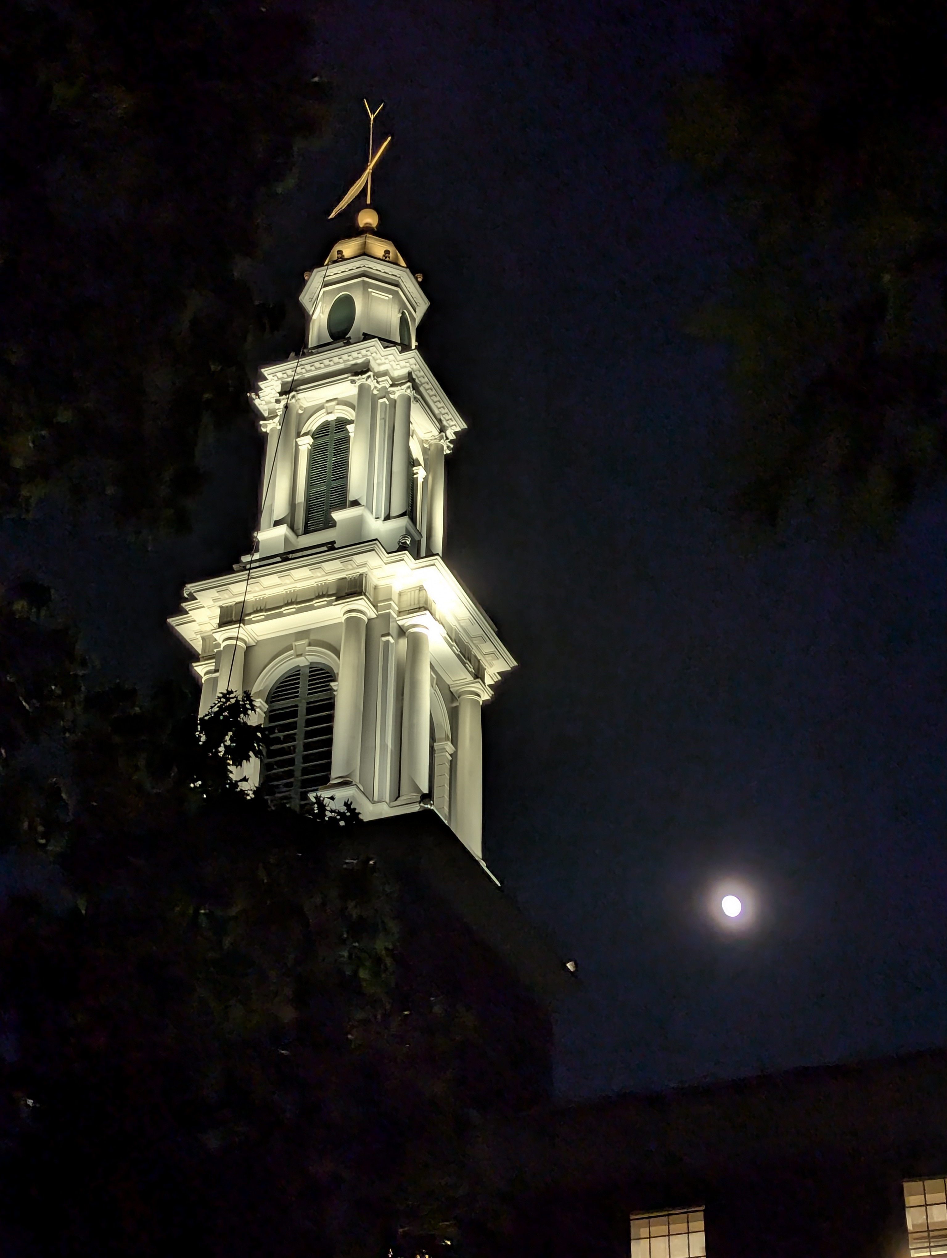 And on the way back to my dorm room, I took a photo of the illuminated and fully restored Chapel tower. The Chapel is the centerpiece of the college, it’s an area of worship and a meeting center and a talisman for students. And the moon was nearby as well.