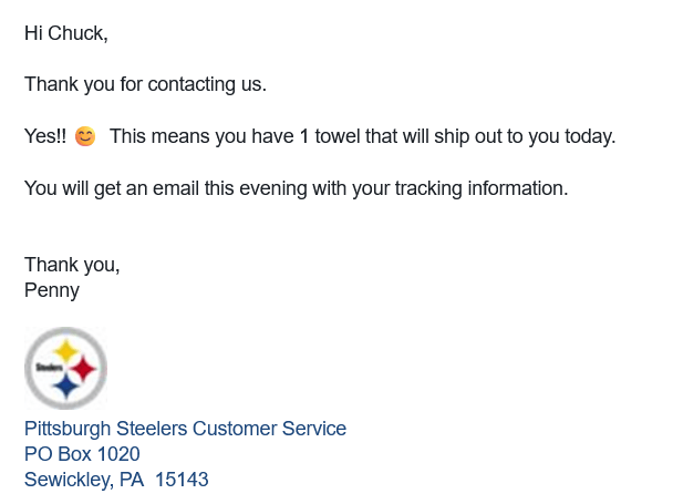 And the idea stuck. And the towels – for which all proceeds from their sale and manufacture go to a school for special needs in Western PA – is now the de facto symbol of Steelers fandom. Trust me on this.