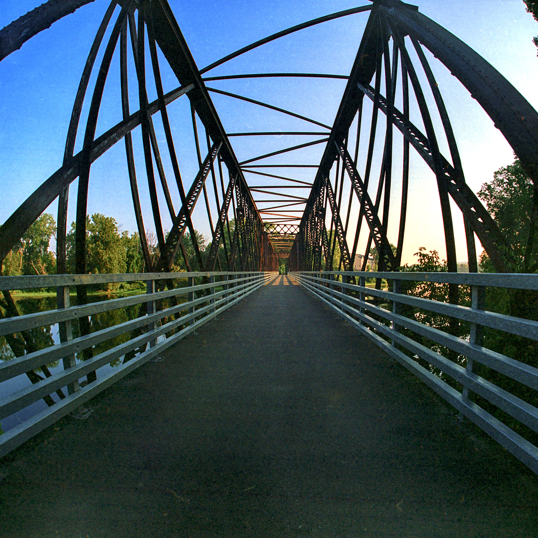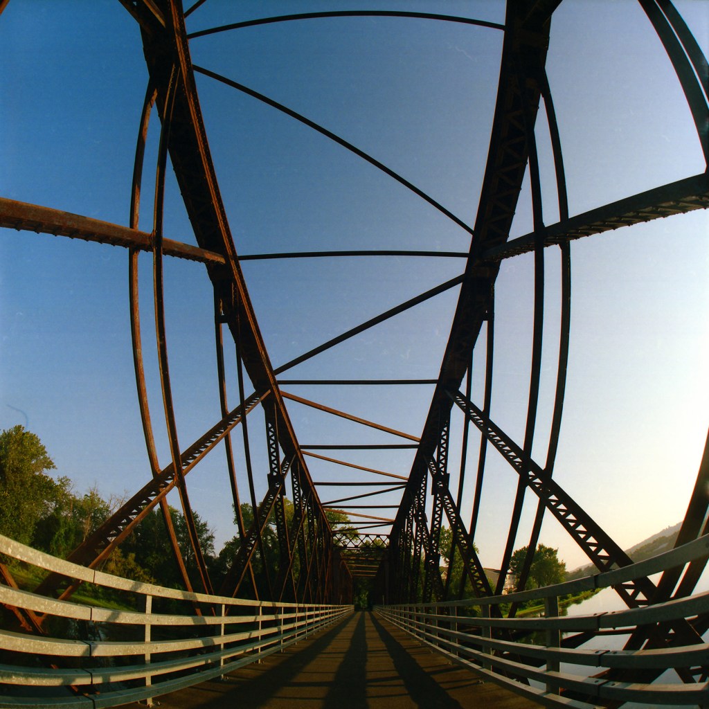 It’s on the other side of Green Island. It’s the former railroad trestle that once allowed the Delaware & Hudson to cross between Green Island and Van Schaick Island, and now exists as a pedestrian bridge. The bridge has plenty of metal support beams that will work wonders with a fisheye lens.