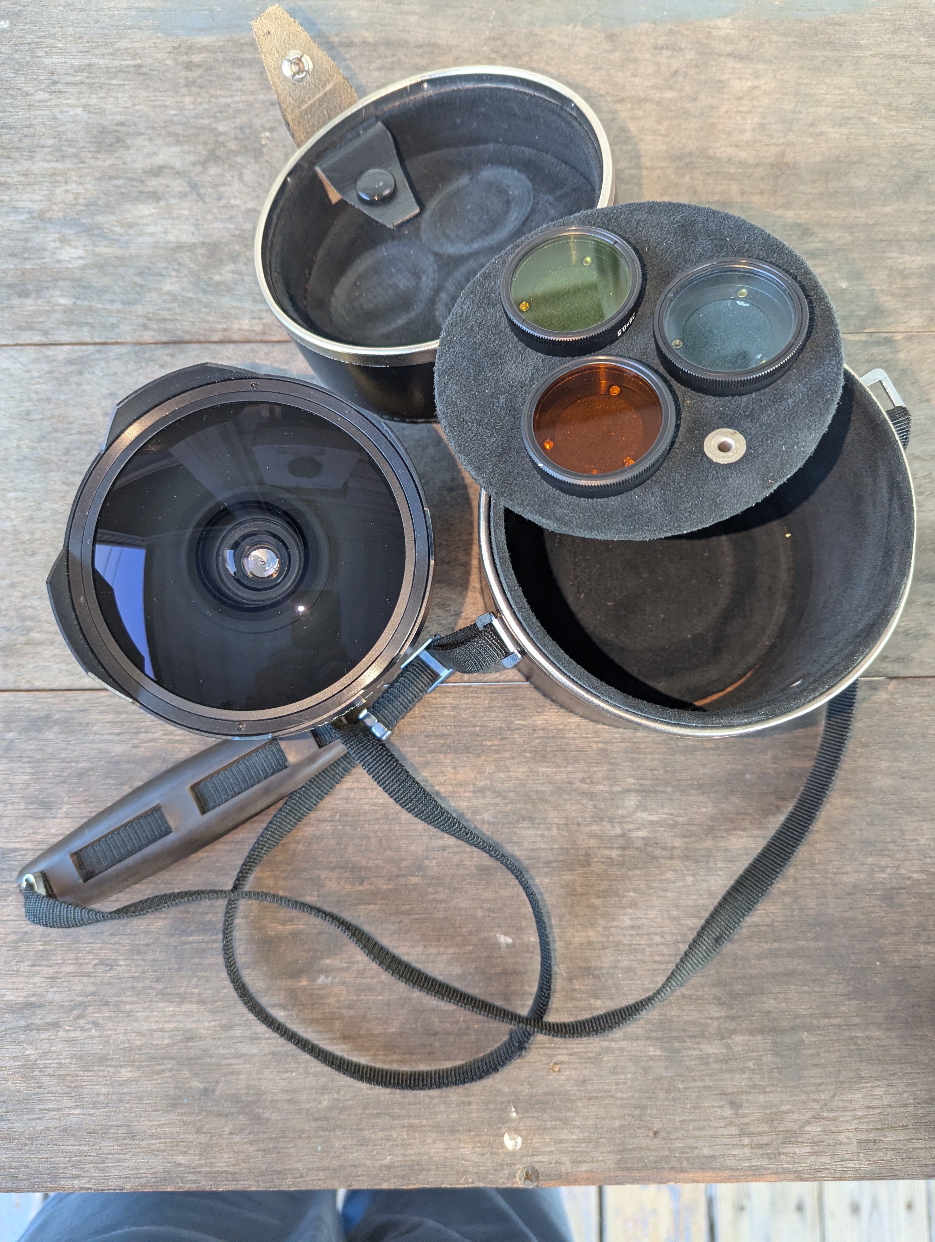 In addition to my Carl Zeiss Jena Biometar 80mm f/2.8 lens, my Carl Zeiss Jena Flektogon 65mm f/2.8 ultrawide lens, and my Meyer Optik Görlitz 500mm f/5.6 telephoto (yes, this is the “Johnny Wadd” lens), I now have a 180° Zodiak f/3.5 fisheye lens.