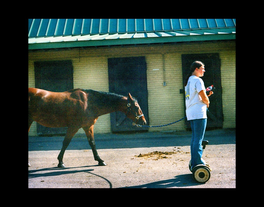 Modern Horsewalking. Pentacon Six TL camera, Carl Zeiss Jena Biometar 80mm f/2.8 lens, Kodak Portra 400 film. Photo (c) 2025 Chuck Miller, all rights reserved.