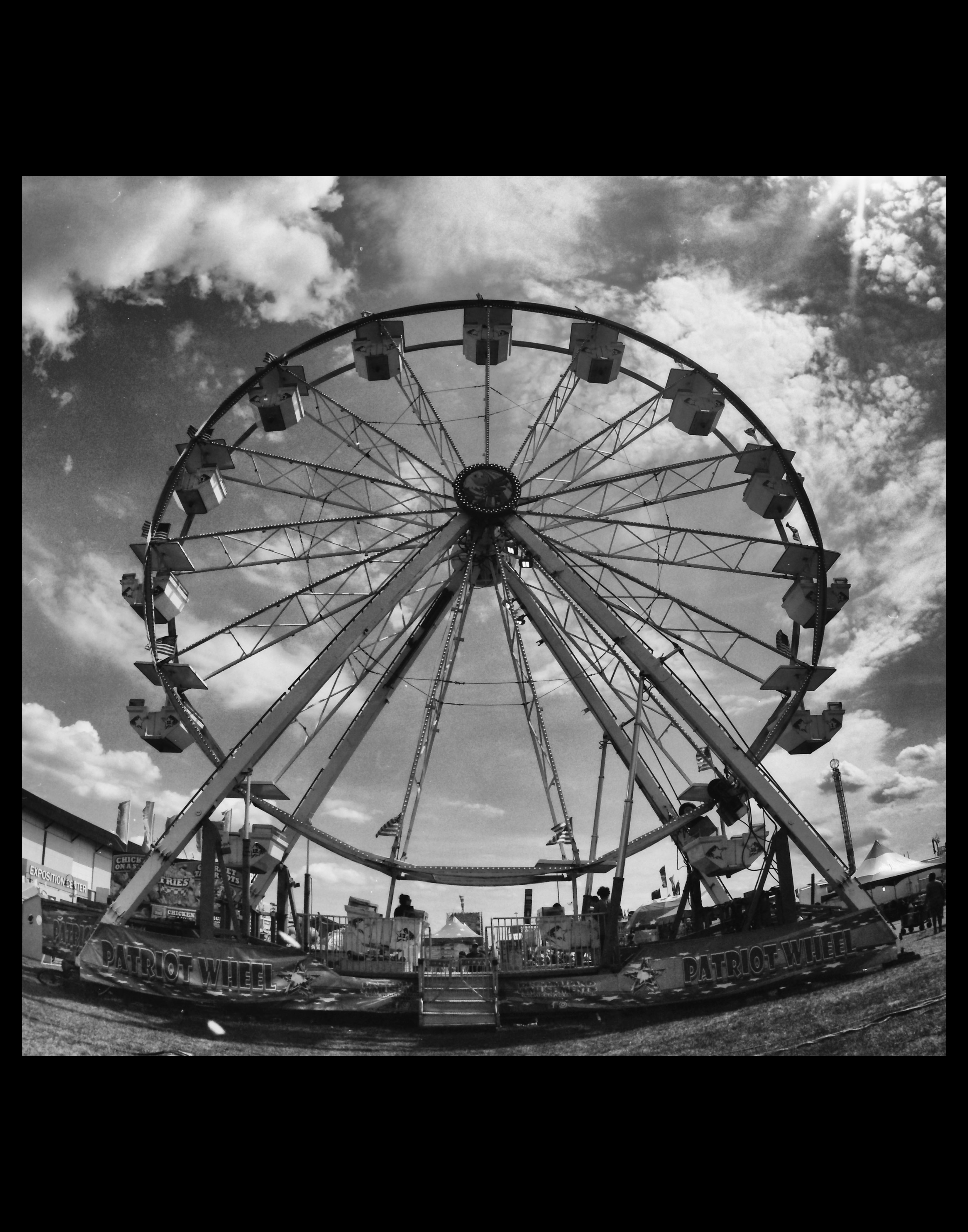 Wheel in the Sky. Pentacon Six TL camera, Zodiak 30mm f/3.5 fisheye lens with yellow filter; efke 100 film. Photo (c) 2025 Chuck Miller, all rights reserved.