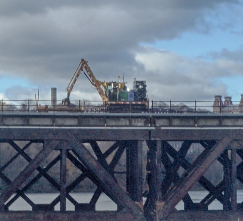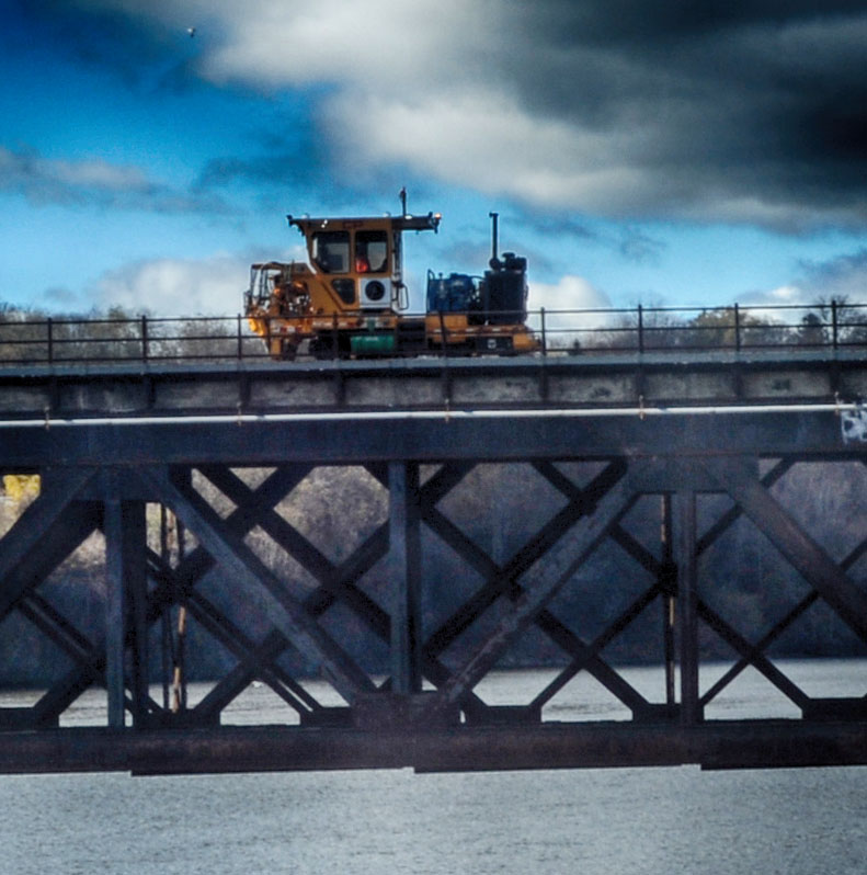 Meanwhile, as I’m testing my lenses, I’m watching as a slew of railroad construction vehicles traverse the tracks.