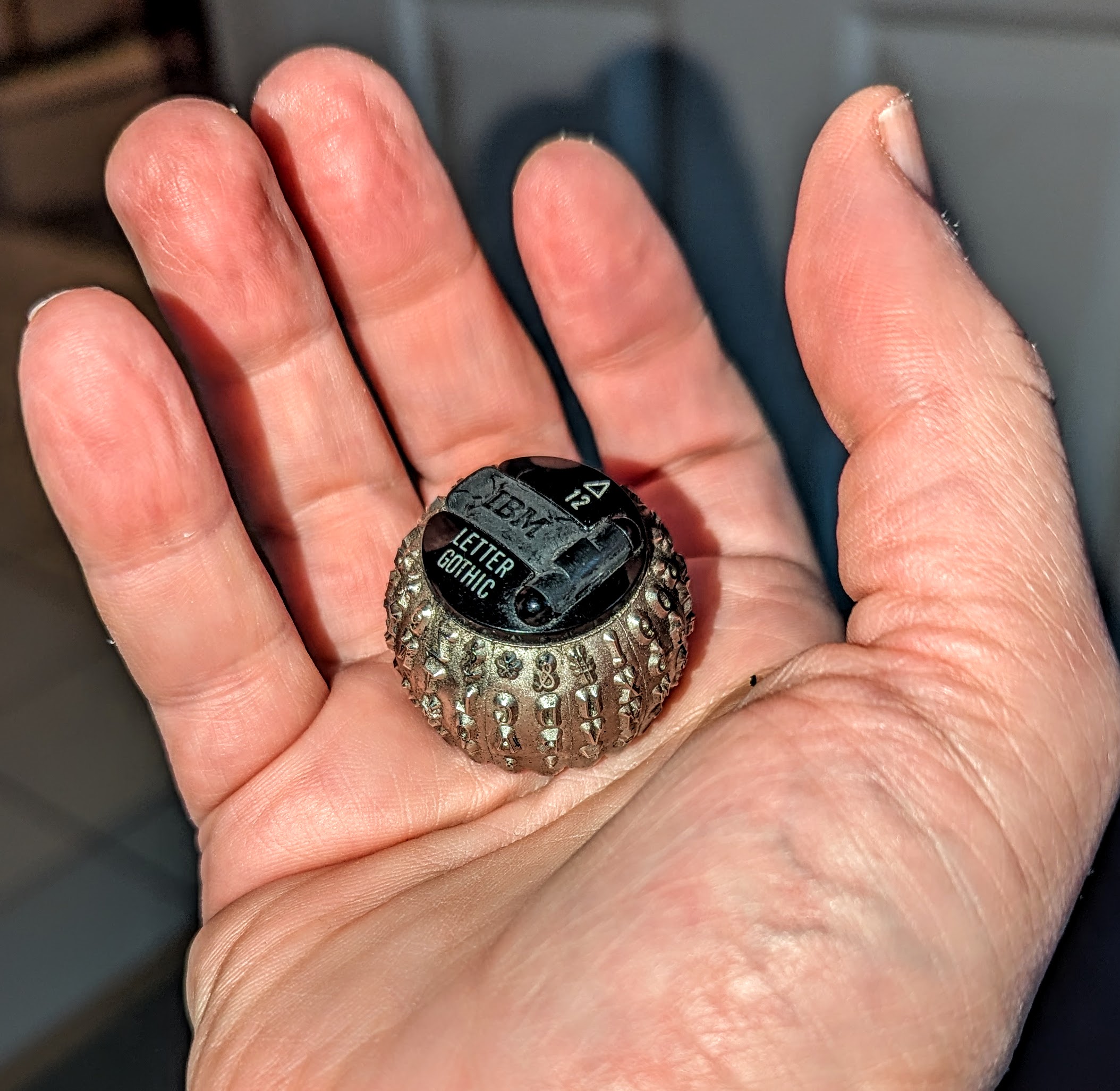 I found out later in life that those little balls were called “element balls,” and IBM made a series of them in different fonts and spacings. You could get your element balls in 10 point or 12 point (there may have been a 15 point one, I don’t know), in fonts of Pica or Gothic or Script.