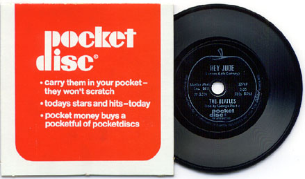 Americom’s Beatles line included not only the Fab Four, but many artists on Apple, including the Iveys, Billy Preston and Mary Hopkin. The records themselves were monochrome flexidiscs – instead of a yellow-orange Capitol swirl or a green ready-for-picking Apple label, these discs had a simple white logo on a black background – the flexidisc Apple looked closer to its computer trademark counterpart than to the Beatles logo.