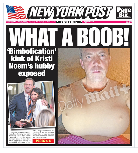 Of course, MAGA talking heads are trying their best to spin this into something different. Case in point – Megyn Kelly, the PRIDE of Bethlehem High School and of Albany Law School (blecch), explained on her podcast that Bryon Noem’s fetish gave Kristi Noem the right to escape her marriage and sleep with former Trump aide Corey Lewandowski. Yep. She’s defending Kristi Noem having an extramarital affair because Bryon Noem is wearing breasketballs.