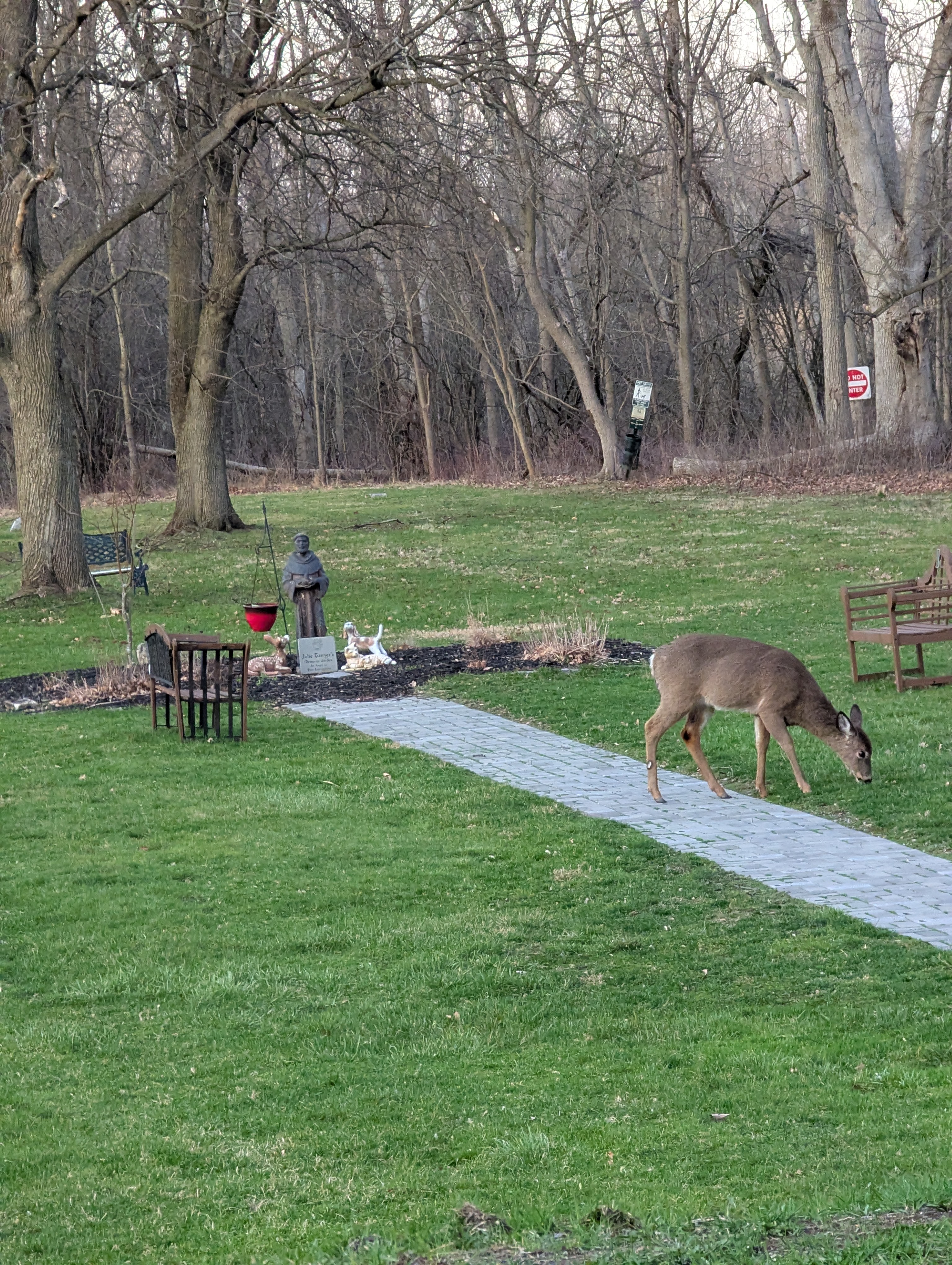 Last Friday, after dropping off my empties, I was about to ease my way back onto the main road when I saw – over at the Humane Society’s green walkway and meditation area – a few young deer. They were munching on the green grass. They were enjoying themselves.
