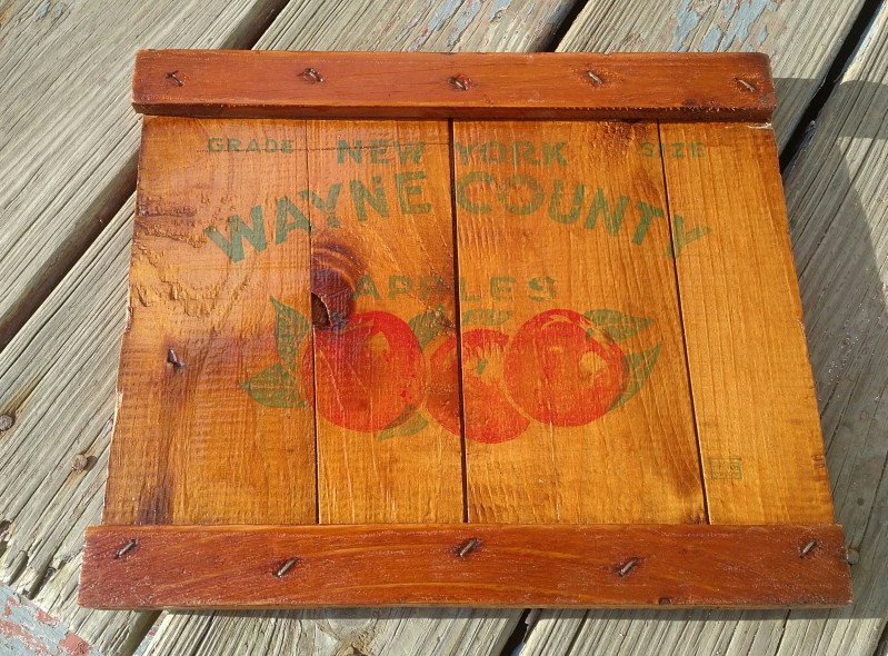 I’ve been going through an “upcycle recycle” wooden crate phase of late, and my most recent acquisition is this Wayne County apple crate. That’s a cool logo on the front of the crate – NEW YORK WAYNE COUNTY APPLES on the front, along with a few painted apples to effect.