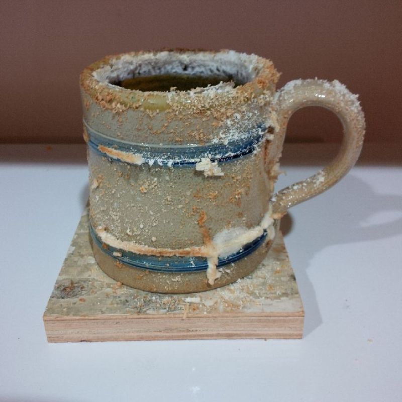So I’ve been having fun with this “salty mug” concept, to the point where I want to have a mug explode in excreted salt lines.ย Eventually I’ll come up with a great photo concept on this, but for now I’m just having fun destroying drinking mugs. My concept and theory was based on this blog…