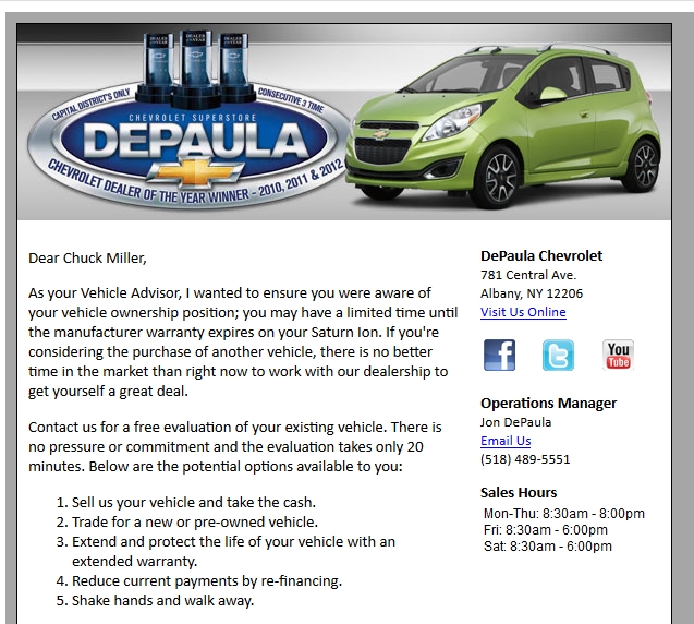 Last August, I wrote a blog post about how DePaula Chevrolet still thinks that I own my 2005 Saturn Ion “Cardachrome,” even though I got rid of it nearly two years ago. After a blog post and a few calls over to the dealership, they agreed that I shouldn’t be receiving these zombie e-mails and…
